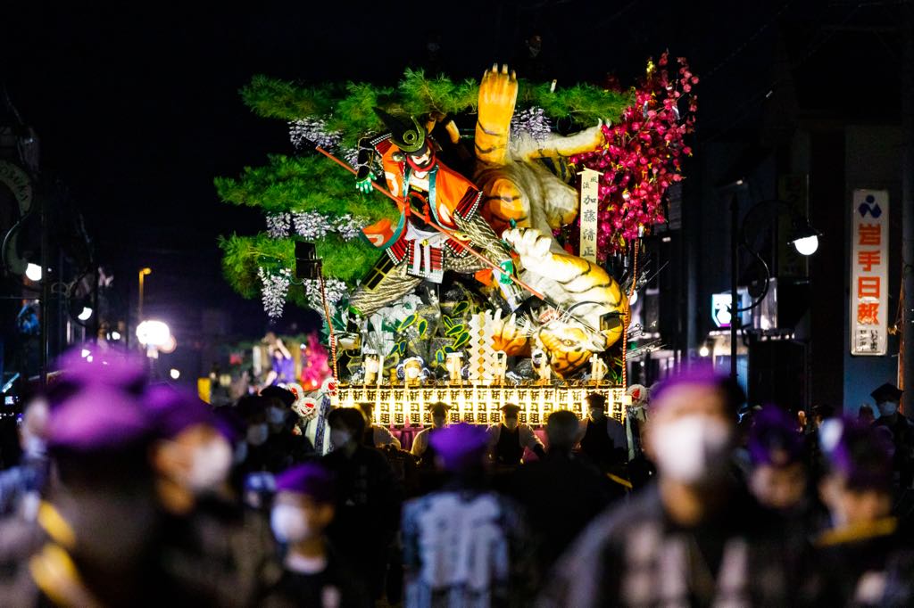 100年以上伝わる岩手町の秋まつりは、町民はもちろん、町内外の祭り好きが一丸となって盛り上がる伝統的な行事。なかでも人形や造花などで装飾された南部風流山車はじつに豪華絢爛で、山車とともに人々が町内を練り歩く様は圧巻です。